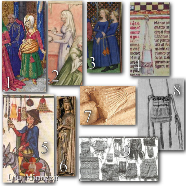 Wie biste bloß auf diese Idee gekommen...also abgesehen davon, dass nur sehr wenige Darstellungen im 15ten noch Aumônières zeigen, auch zwischen den Kleidern, hängen diese wenn dann an ganz normalen Gürteln. Nestelbänder als Gürtel kenne ich wirklich keine (höchstens _an_ Gürteln, nämlich solchen, die mit Nesteln geschlossen werden, da gibt es schon Beispiele), schon garnicht die Verlägnerung der Nestelung des Kleides.